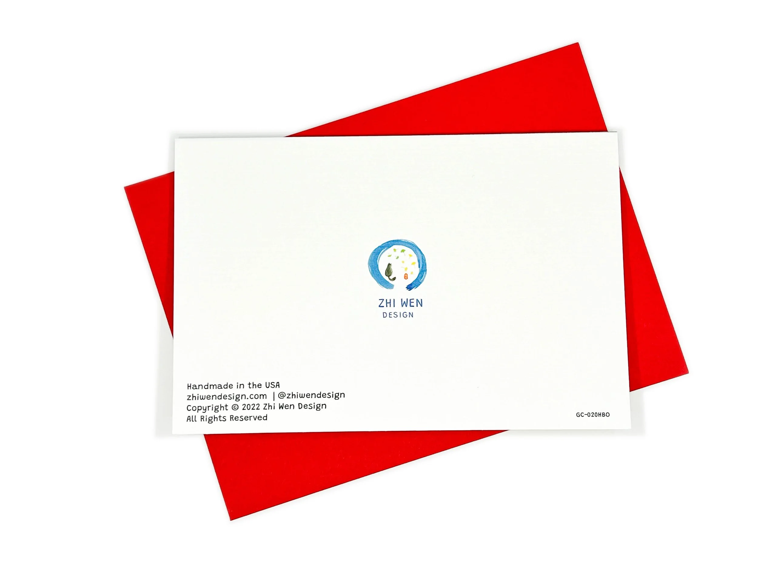 Designed digitally and printed on premium heavyweight linen paper, the inside of the card is blank and it comes with a colored envelope to match.